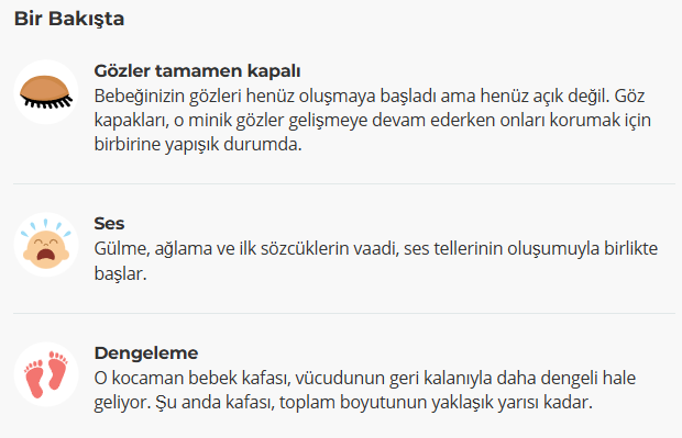 Bu hafta ayrıca gelişen bir şey daha var: Bebeğinizin ses telleri (“Seni seviyorum anneciğim!” demenin ilk adımı). Henüz ağladığını veya mırıldandığını duyamıyorsunuz, ancak doğduğunda o küçük sesinin iyice çalışacağından emin olabilirsiniz.