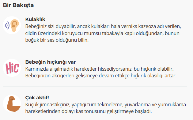 Bebeğinizin tat alma duyusu da artık oldukça gelişmiş. Bir tat testine mi ihtiyacınız var? Baharatlı bir şeyler yerseniz, bebeğiniz amniyotik sıvıdaki farkı tadabilir. Ancak, sizinkinden yaklaşık iki saat sonra geleceği için, sizinkinde farklı öğün saatleri olacağını unutmayın.